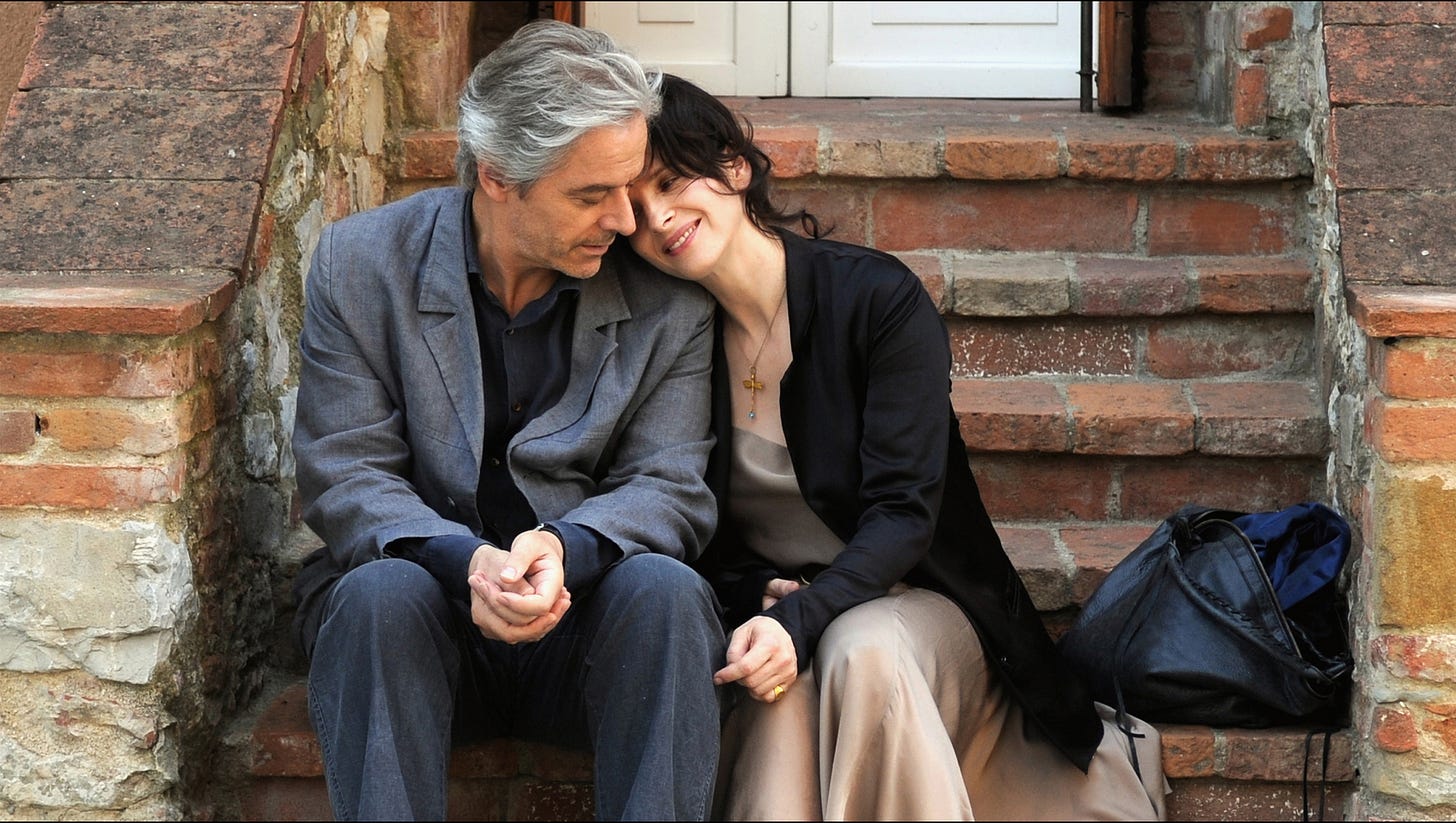 William Shimell plays James Miller, a British author and art historian promoting a book whose thesis is that copies of artworks hold the same value as their originals. Think of it as the plastic Venus de Milo your aunt bought for eight euros near the Louvre, wedged between a dying succulent and a Penguin Classic she picked up at Stansted in 2009. Shimell is an opera baritone in his other life so a Tuscan lecture hall containing thirty-five attendees and one spectacularly bored ten-year-old is unlikely to faze him. The boy belongs to Binoche. You can see him trying to get his mother’s attention convinced that she is about to follow an intellectual into a car and ruin his afternoon.